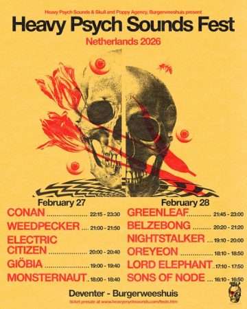 Heavy Psych Sounds Fest 2026 vindt plaats op vrijdag 27 en zaterdag 28 februari met op het programma Conan, Greenleaf, Belzebong en meer. Tickets kosten 32eu per dag of 64eu voor het hele weekend, en zijn verkrijgbaar via de Burgerweeshuis website.
